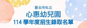 心惠幼兒園114學年度招生錄取名單 發佈日期: 2025 年 5 月 16 日2025 年 5 月 16 日 作者: preschool SH 親愛的家長您好: 恭喜您的孩子即將加入心惠的大家庭,成為本園的新生!我們誠摯歡迎您與寶貝的到來,期盼在未來的日子裡,一起陪伴孩子快樂成長、健康學習,展開充滿愛與探索的幼兒園生活。 為了順利完成入園手續,敬請您留意接下來的報到與註冊相關日期與事項,若有任何問題,也歡迎隨時與我們聯繫。 再次歡迎您加入心惠大家庭 心惠幼兒園114學年度招生錄取名單
